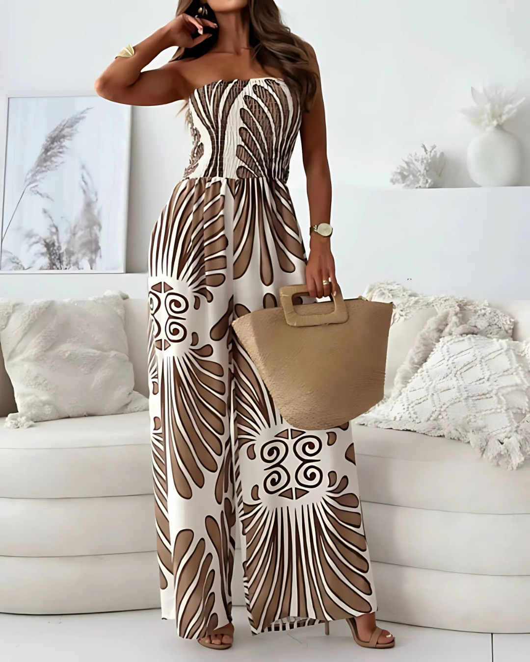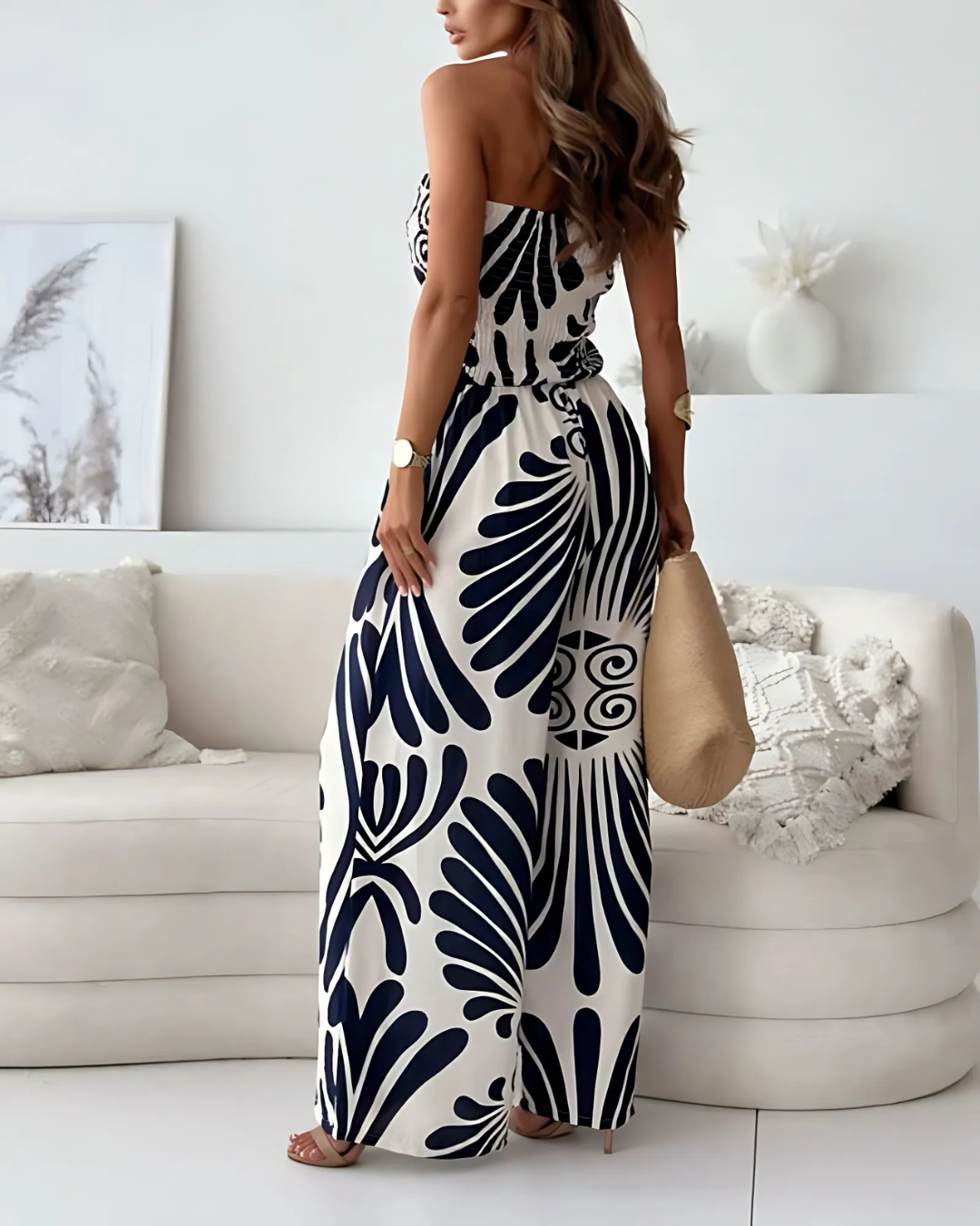 Prepárate para lucir este mono sin tirantes que está a la última. El estampado artístico crea un llamativo contraste que te hará destacar con elegancia en cualquier ocasión veraniega.